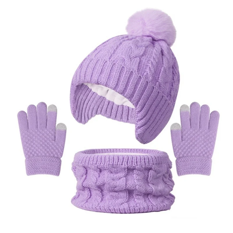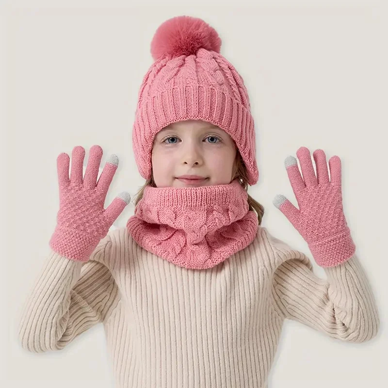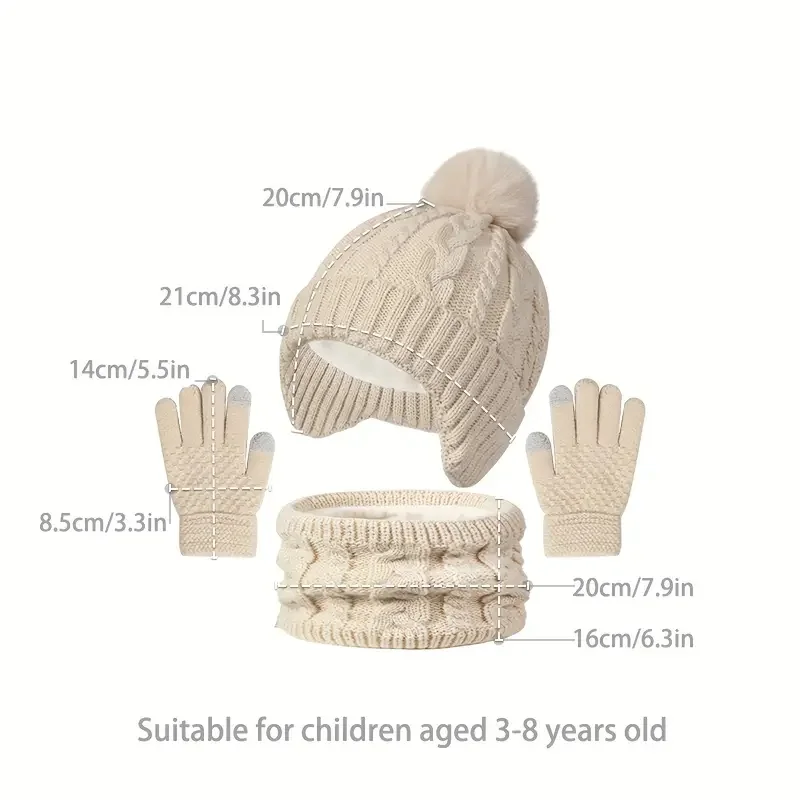 3Pcs Children Knitted Hat Scarf Gloves Set Fleece Lining Warm Kids Winter Hat Neck Warmer Suit Child Bonnet Cap Kids Beanie 3-8Y